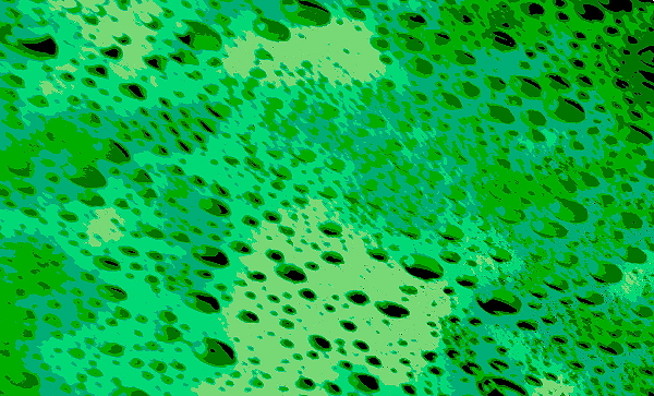 An experiment to re-create this effect directly has not yet been attempted. We believe a slurry above 100ºC would be required . Alternatively, a slurry using sand and frozen carbon dioxide may be a useful test. Failing those routes, we have taken simple photographs of large sheets of soap foam floating on water. By stretching the photographs to generate ovals, we have produced graphics which closely simulate the pay planforms and size distributions seen on the earth. These were colorized to simulate landscape.