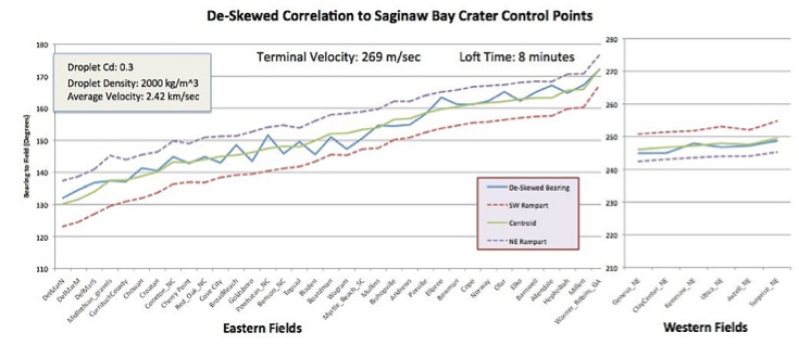 The solution shown in the graphic above is problematic in that the loft time is well beyond times generated by ballistic trajectory tools. Using a numerical model developed to account for the skewing of the inferred alignments during the aerodynamic breaking and landing events due to earth-rotational velocity differences which are latitude related, we now have a satisfactory solution that yields loft time in the range of 5 to 10 minutes, We discuss this "systematic by latitude" alignment factor in the subtopic page. Satisfactory results are now available with loft times in the range of 5 to 10 minutes. The following graphics show the correlation of each bay field's alignment with the proposed Saginaw impact crater .