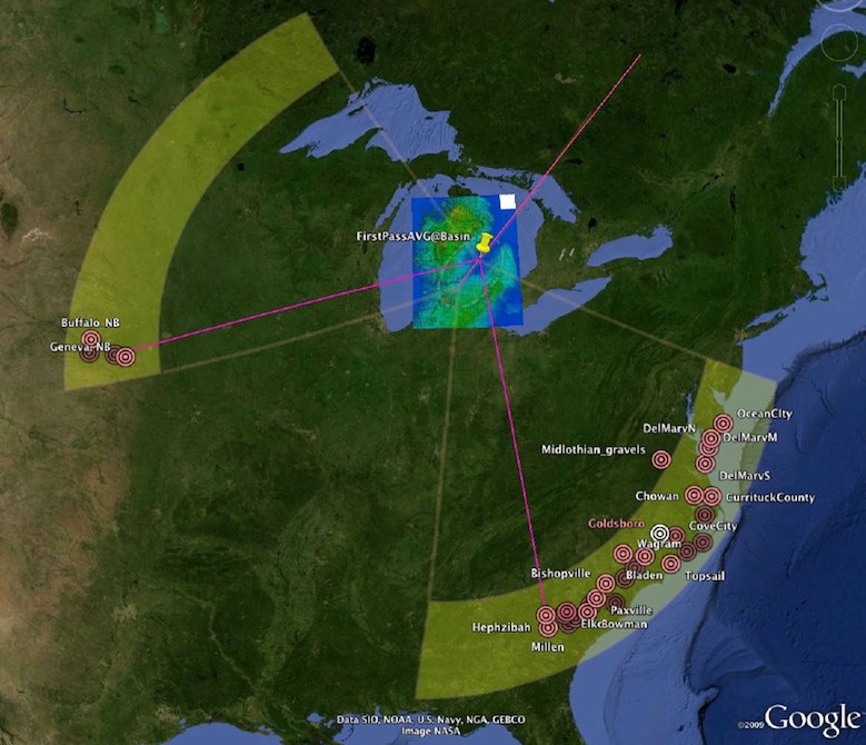 Given our new tools, it is even easier to visualize the ejecta trajectories and to reassess and reconfirm our triangulation approach. The final mash up suggest that the Saginaw Bay area is a probable impact site for distal ejecta lofted to the Carolina bay fields.