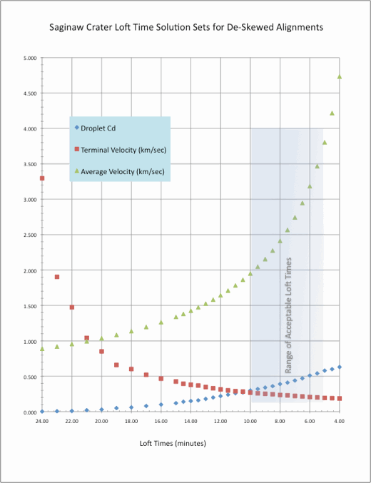 The chart highlights the probable velocities and resulting loft times. Once the input variable for the average velocity exceeded ~2 km.sec, the terminal velocities required for a Saginaw loci solution approached a 200 m/sec asymptote. Empirically, this would suggest that the ground vector component of the terminal velocity of the ejecta was ~200 meters/sec. We believe that the 200-300 meters/sec range for terminal velocities that were identified are highly correlated to the ~360 meter/second value seen in a separate terminal-velocity calculation for a 100-meter diameter droplet of ejecta. Note that only the ground vector of the velocity is being considered in the de-skewing calculations, which would be lower than the total 3-d terminal velocity. The value of ground component would depend trigonometrically on the vertical angle of incidence that the ejecta approached at; these calculations assume a 45º angle.