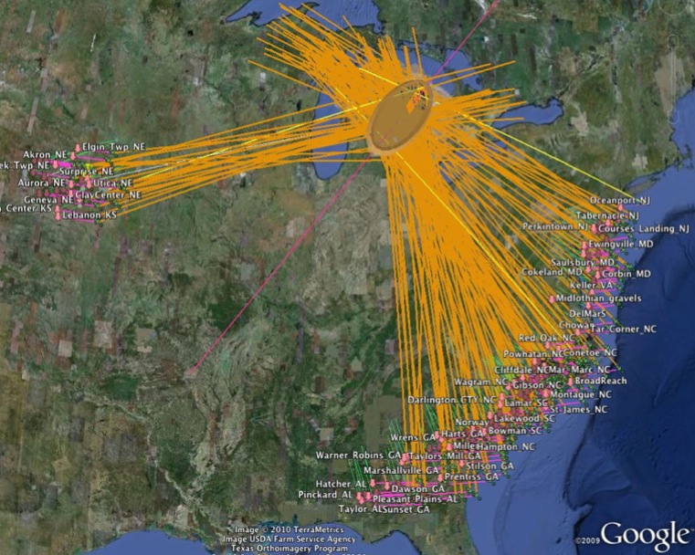 Our motivation for providing the calculator as a web-based tool is to encourage testing of the relevance of the model by those interested in our conjecture. The tool must be used in concert with the freely-available Google Earth viewer. In addition to any Carolina bay location information you may already have access to, we refer the reader to two sources: