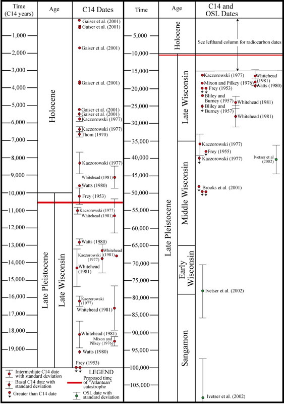 Until recently, the geochronology techniques available to place constraints on the timing of recent events have included carbon dating, thermo-stimulated luminescence (TSL), optically stimulated luminescence (OSL), thermally transferred OSL (TT-OSL), and temporal controls from the ages of surfaces covered by Carolina bays. Identification of a wide date range for elements of the bays’ underlying basin structure would falsify any impact hypothesis, and other workers have reported such results (Ivester, A.H, et al, 2007) using OSL techniques. We suggest all Carbon dating and OSL dating to date only identify minimal ages for the bays, as the reported dates are all less than our assumed creation event date. Given the composition of a Carolina bay rim as unconsolidated surface deposits of sand, it should be expected that wind and wave re-workings of the landform would have been an ongoing process since their creation.