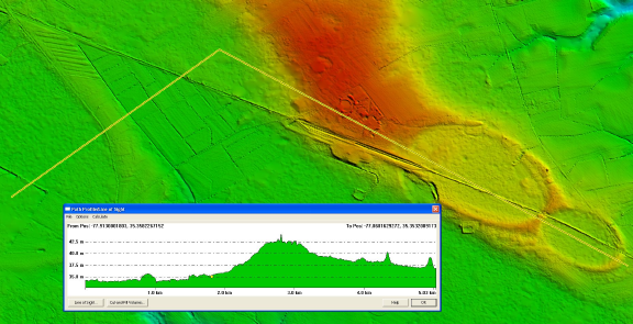 In another LiDAR view, 1/9 arc seconds, we see the ridge detail, along with the two bays within the ridge. The graphic includes the Global Mapper elevation profile across the central bay, up the ridge and down through the two ridge bays. The elevations represented are significant. The graphic is linked to a higher resolution version.