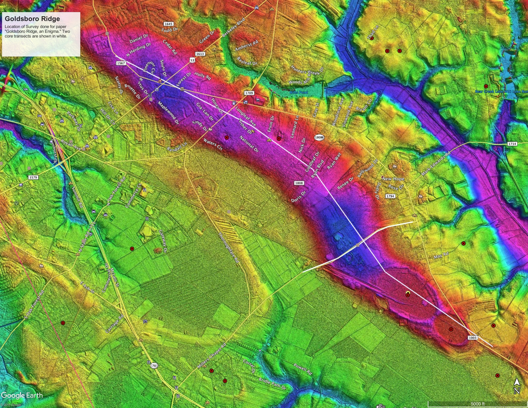 Goldsboro Ridge, NC Here is an image captured from Google Earth using the kmz linked above. A higher resolution version is available by clicking on this image.