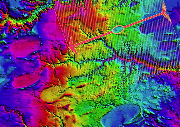 Our use of elevation data includes the generation of "elevation profiles", which attempt to relate the disparate altitudes of bays in a region. We interpret this to be an effect of the "blanket" draping over previous landscapes. Here is an example of the Genera, NE region. Bay floor elevations range from 535 MASL to 495 MASL over a distance of 32 miles. As is the case in the east, the deposition of basins is seen on a continuum without regard to elevation. This correlates with our blanket hypothesis, as the ejecta layer is spread across existing terrain.