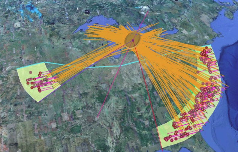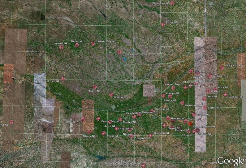 We have created Google Earth kml elements to explore ~40 fields dispersed across eastern Nebraska, and an additional 2 in Northern Kansas. The use of USGS-provided digital elevation maps (DEM) of the area has allowed for this identification, as the characteristic shape and orientations are rarely seen or identified on the ground or in satellite imagery. Much effort has been extended to identify these areas, and the process continues across the expected ejecta ring areas. Our failure to locate more bays to the North or South of the Nebraska bays is considered to be attributable to the rough terrain in Kansas, as well as the glacial cover present at the time from South Dakota northward.