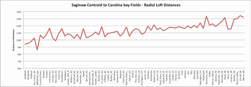 Using a proposed centroid for the Saginaw Bay impact at 43.63 N latitude and 83.94 W longitude, we computed the great circle distances for each of the fields. The chart below presents the fields in a clockwise direction. We feel that the highly correlated loft distances are indicative of a common flight time, loft angle and source for the ejecta at each of the location. Note that the western fields correlate with with the eastern fields. We propose that the "butterfly" provided more energetic ejecta velocities towards the down-range direction, yielding more loft time and distance.
