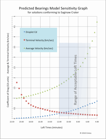 The mathematical model developed here is considered by us to be very simple and elegant. The only variables being perturbed are the average velocity of the ejecta during its flight (with loft time as the tuning proxy) and the terminal velocity of the falling droplet of ejecta ( with the pellet's coefficient of drag Cd as the tuning proxy). At each field of bays, we extract the latitude and longitude as test case input constants. The model was heuristically focused on the Saginaw Bay proposed structure and it's three control points (NE, Centroid and SW); those latitude and longitude values are similarly applied as constants across all calculations. The 42 bay location "fields" represent many thousands of individual bays, and the solution sets are resolved against all fields simultaneously, with all bearings falling within the control points. While it would seem plausible that the ejecta at any given location may actually have a density or velocity different from other locations, the model did not have to leverage such fine tuning to arrive at simultaneous solutions for all 42 fields.The great physicist John von Neumann once disposed of a mathematical argument by saying, "With four adjustable parameters, I can fit an elephant; with five I can wiggle his trunk."