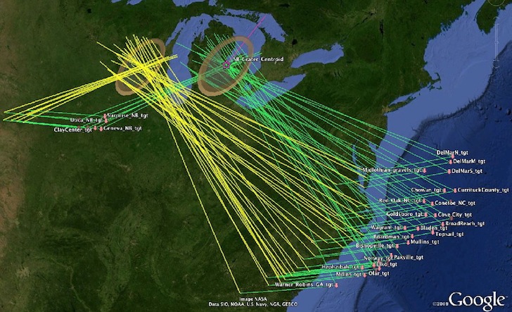 With this model enabled in our KML generator spreadsheet, we can very easily generate a variety of "what if" scenarios. For instance, it is very easy to regenerate the entire class of great circle lines for our ~140 ejecta fields, using a different Coriolis offset (say 28 minutes). Of course, with the empirical data available, the triangulation (especially with the inclusion of the Nebraska fields) brings forward a fairly tightly constrained loci point for the crater.