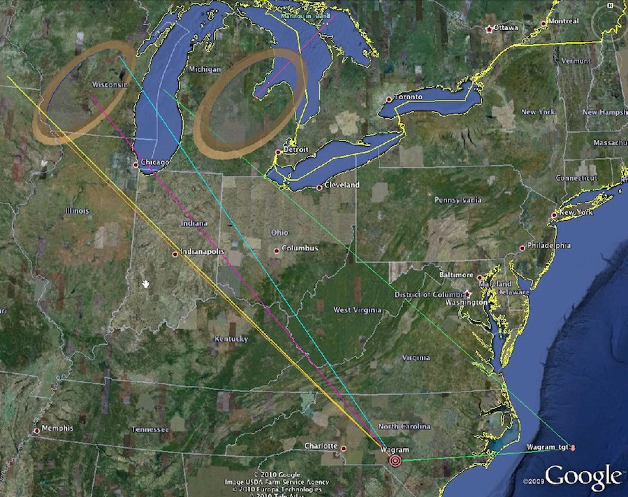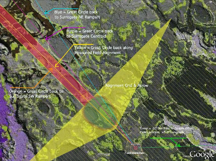 With the identification of Saginaw area as a probable impact location, our research efforts have been reinvigorated. We can now offer additional approaches to visualizing the dynamics of the impact, and to enhancing the correlations between our conjecture and the landscape. As we discussed earlier, the inferred bearing is a function of the original loft azimuth, which would have deposited the fields of ejecta out in the Atlantic Ocean (for the eastern components). An alternative to the Surrogate crater conceit is to offset the field due east by the Coriolis offset (currently 5.5 degrees), and then use trigonometric formulas to generate a great circle back along the inferred arrival bearing. The next graphic displays the Wagram field, with all the generated great circle lines identified.