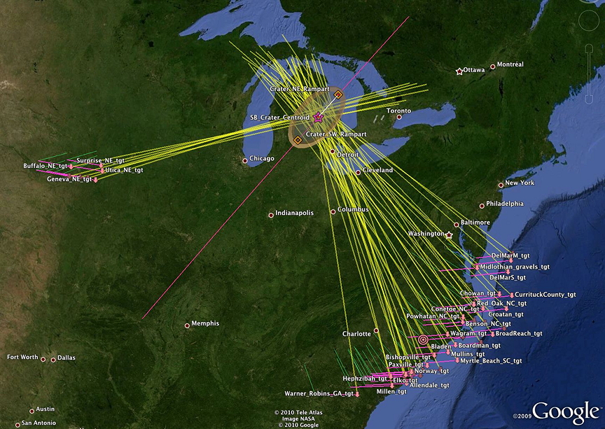 Google Earth path sets for each of the plotted points in the chart above were generated to visualize the loci focus. The chart below is considered the most likely 'average" solution to the set. During the actual proposed impact, ejecta density and terminal velocities would likely vary by field.