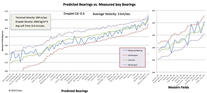 In the case of distal ejecta, the land and atmosphere are moving rapidly west-to-east under the falling ejecta. During the terminal velocity atmospheric braking the latitude difference between the proposed crater's rim and the bay location create an W>E velocity delta because of the earth's spherical shape. That effect increases in magnitude as the landing sites move more southerly. At our most southerly field, Warner Robins, GA, the ground speed difference is 197 km/hr. Amplifying the latitude effect, the 197 km/hr delta is applied to a W>E loft velocity vector that is smaller relative the those of the more northerly fields, resulting in a higher percentage adjustment. The following graphic attempts to exhibit the numerical adjustments we make to the inferred alignment to arrive at a de-skewed bearing for each bay. The graphic uses the metrics of Wagram, NC's field.