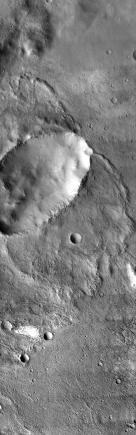 In the heavily cratered southern highlands of Mars, the type of crater seen in this THEMIS visible image is relatively rare. Elliptical craters with "butterfly" ejecta patterns make up roughly 5% of the total crater population of Mars. They are caused by impactors which hit the surface at oblique, or very shallow angles. Similar craters are also seen in about the same abundance on the Moon and Venus.