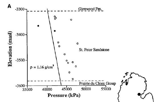 In this chapter we examine evidence for anomalous pressures in the deep Michigan basin. The primary formation of interest is the Middle Ordovician St. Peter Sandstone, which became an active gas play in the 1980s with production extending to depths of over 3500 m. Related chapters in this volume (Drzewiecki et al.; Shepherd et al.; and Wang et al.) describe the sedimentologic, diagenetic, and thermal processes that have affected this formation. Figure 1 shows structure contours on the top of the St. Peter, in meters relative to sea level (masl), along with locations of major gas fields. Over most of the Lower Peninsula of Michigan, the top of the St. Peter occurs at elevations of less than –1700 masl. Producing zones are concentrated in the deep areas of the basin to the west and north of Saginaw Bay.