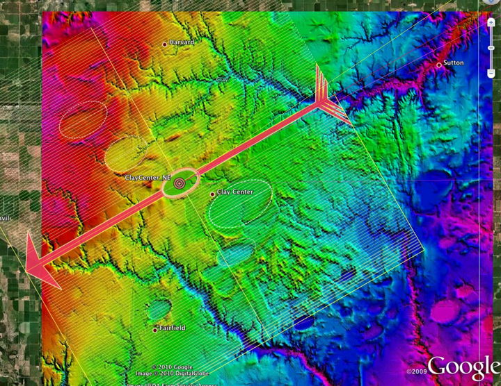 Clay Center, Nebraska Carolina bay Landforms with Calculator-Provided Predicted Bearing Arrow