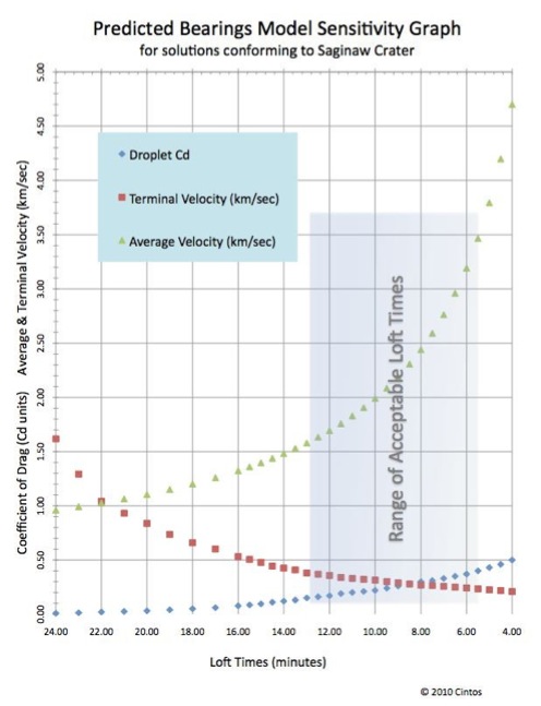 The mathematical model developed here is considered by us to be very simple and elegant. The only variables being perturbed are the average velocity of the ejecta during its flight and the terminal velocity of the falling droplet of ejecta ( with the pellet's coefficient of drag Cd as the tuning proxy). At each field of bays, we extract the latitude and longitude as the only input variables. The model was heuristically focused on the Saginaw Bay proposed structure and it's three control points (NE, Centroid and SW); those latitude and longitude values are similarly applied as constants across all calculations. The ~200 bay location "fields" represent many tens of thousands of individual bays, and the solution sets are resolved against all fields simultaneously, with all predicted bearings falling within the control points. While it would seem plausible that the ejecta at any given location may actually have a density or velocity different from other locations, the model did not have to leverage such fine tuning to arrive at simultaneous solutions for all 200 fields.