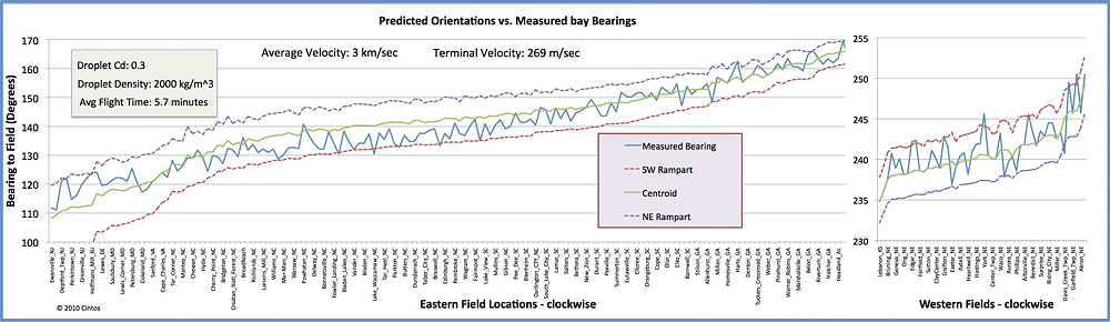 Please reference the two help pages and the calculator using the links above or the panel on the left sidebar. The chart below shows the results of the default settings, as seen at ~140 fields in the Distal Ejecta Fields kml set. The chart graphs the predicted bearing from each field assuming it had been ejected from the crater's centroid (green line) against the empirically measured inferred orientation at that field. The dashed lines represent the predicted bearing assuming the ejecta had been lofted from the northeast and southwest ramparts of the crater, and are effective control bounds for the fuzzy orientations we expect from a large impact event.